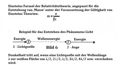 Die Geschwindigkeit des Lichts (pulsierende Energie) ändert sich je nach Medium, durch das es hindurchgeht. Zum Beispiel breitet sich Licht anders im Vakuum, in der Luft und im Glas aus. Diese Tatsache ergibt sich aus Einsteins Formel E = mc², wie in Abbildung 3, Beispiel 7a gezeigt.