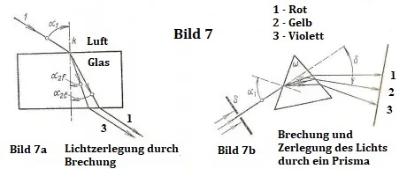 In Abbildung 7, Beispiel 7a, ist der Effekt dargestellt, der als Lichtbrechung bekannt ist. Ein Lichtstrahl, der auf den Rand einer Glasscheibe trifft, stößt auf eine Schicht verdichteter Energie und regt sie an. Verschiedene Lichtfarben haben unterschiedliche Frequenzen; zum Beispiel werden Rot und Violett in unterschiedliche Richtungen gebogen. Wenn der Strahl die Glasschicht verlässt, erhöht sich die Lichtgeschwindigkeit wieder auf ihre ursprüngliche Geschwindigkeit. Durch die Schicht verdichteter Energie werden die Richtungen der Strahlen neu ausgerichtet, und beide Farben setzen ihren Weg parallel fort. In Abbildung 7, Beispiel 7b, sind die Schichten verdichteter Energie unterschiedlich ausgerichtet, was zu einer größeren Streuung der Farben und zur Erzeugung eines sichtbaren Farbspektrums führt.